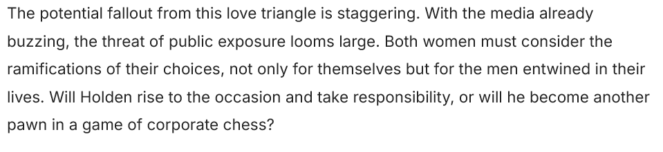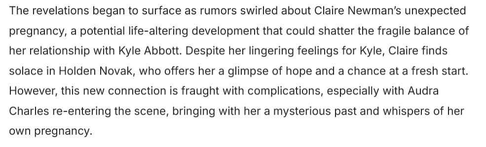 As the tension mounts, the characters are faced with critical decisions that will shape their futures. For Claire, the journey ahead is not just about navigating her relationships but also about reclaiming her identity and breaking free from the shadows of her past. For Audra, the challenge lies in balancing her ambition with the emotional vulnerability that comes with impending motherhood. And for Holden, the path forward demands transparency and accountability, crucial elements in a world where secrets can destroy lives.