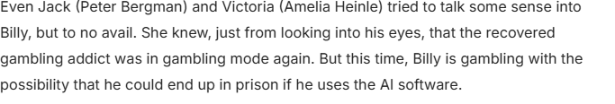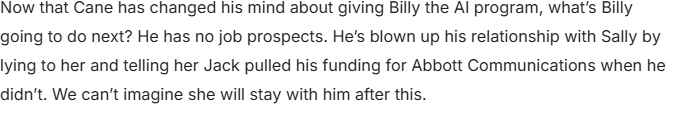 This week on The Young and the Restless was a tough one for Billy Abbott (Jason Thompson). His entire life is now in shambles, all because of Cane’s (Billy Flynn) tempting offer to give him the AI program he claims to have. As some fans have pointed out, we don’t even know whether he really has it.