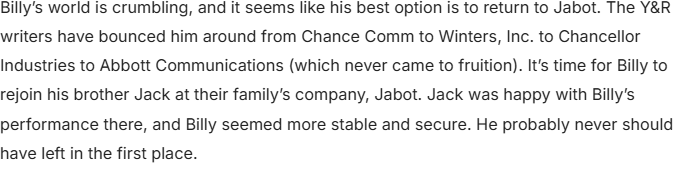 And Billy himself might not want to return to Jabot, since he wants to make Jack proud by running his own company, apart from Jabot. Billy hungers for recognition, and we just want to see him get it, after all the years he’s been striving for it. His portrayer, Jason Thompson, is phenomenal at conveying that hunger and drive. He makes us want Billy to succeed. Many fans of The Young and the Restless have been wanting Billy to get a win for a long time now, even if it means he has to do it by returning to Jabot and being part of a team instead of working solo. Either way, he is long overdue for a win because it’s heartbreaking to watch him constantly fail in all his endeavors. He also needs to forget about beating Victor. It isn’t worth all the emotional turmoil it’s caused him.