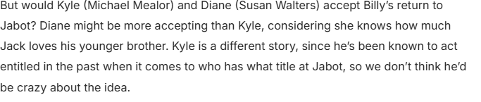 Kyle and Diane might not be thrilled if Billy returned to Jabot on The Young and the Restless