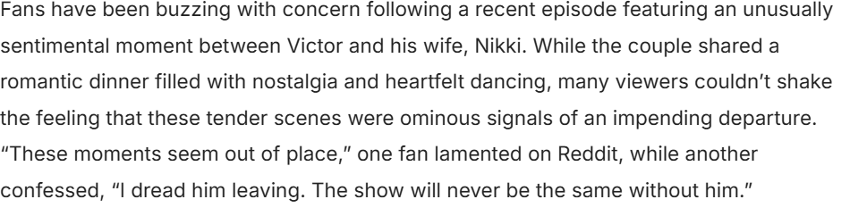 As the drama unfolds, Victor is gearing up for a fierce showdown with Kane, played by Billy Flynn. Despite the tension, Victor’s resilience remains unwavering. With Nikki by his side and a family that rallies behind him, the mustache is poised to confront whatever challenges lie ahead.