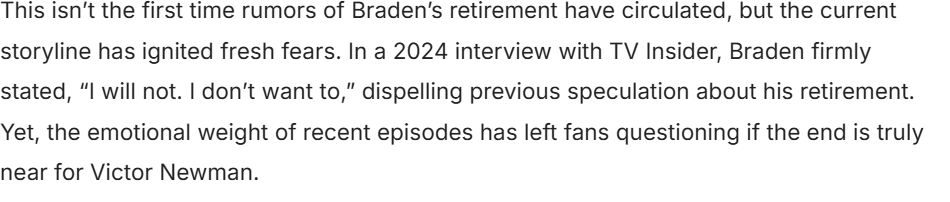 In a shocking twist that has fans of The Young and the Restless on edge, speculation is mounting that the iconic character Victor Newman may be nearing his exit from the beloved soap opera after more than four decades. The beloved patriarch, portrayed by legendary actor Eric Braden, has been the heart and soul of Genoa City, but recent story developments have left viewers fearing the worst.